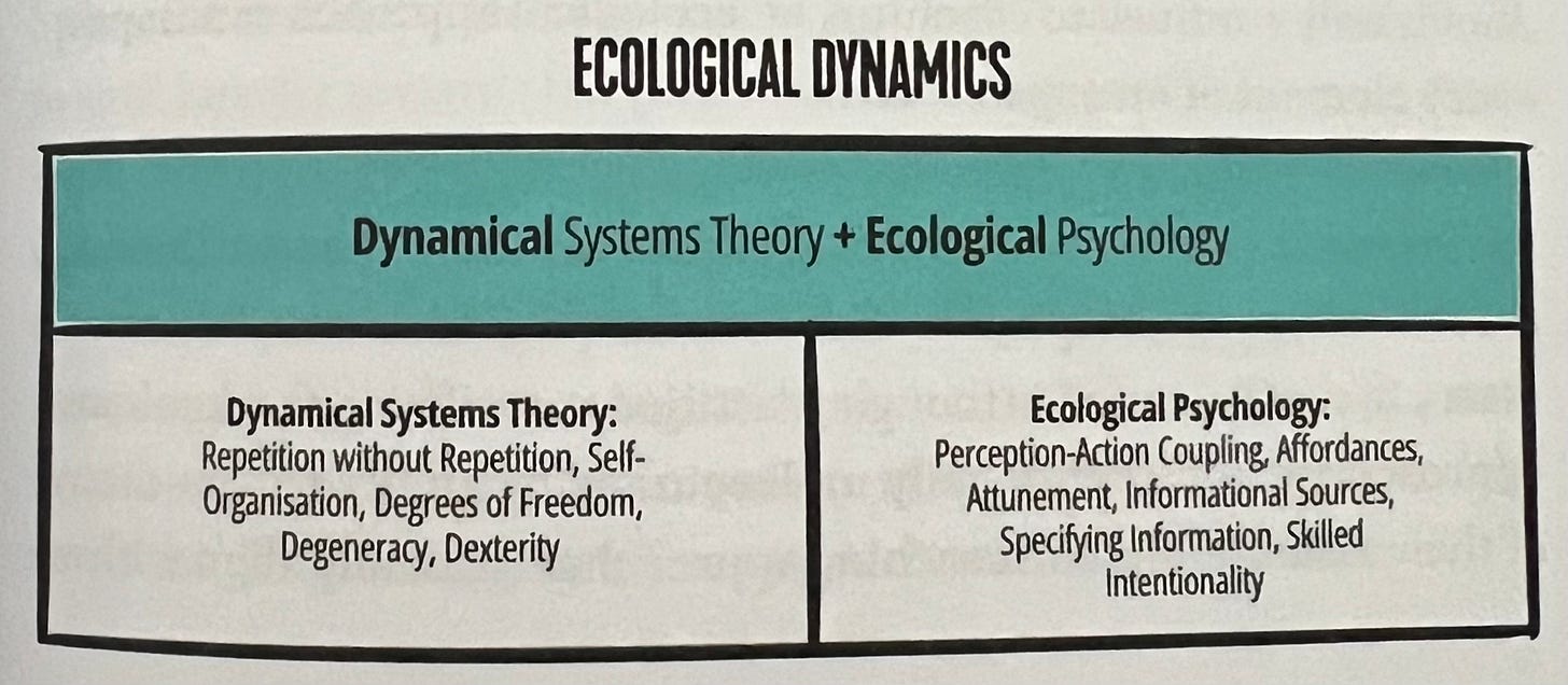 Ecological Dynamics is a theoretical framework that explains how movement and decision-making emerge in sports as a result of the continuous interaction between an athlete and their surroundings. It is grounded in two key concepts: